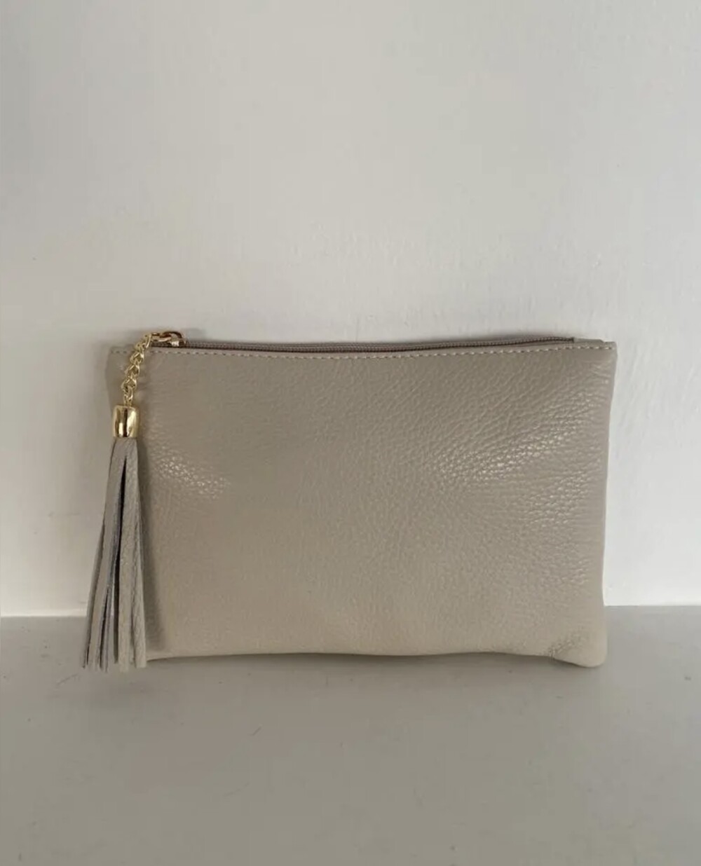 Enveloptas beige leer met kwastje en goudkleurige ketting