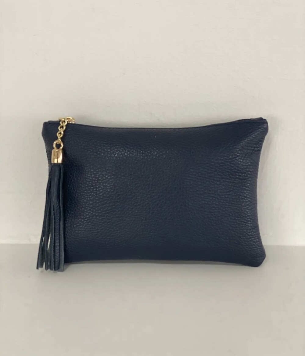 Enveloptas donkerblauw leer met kwastje en goudkleurige ketting