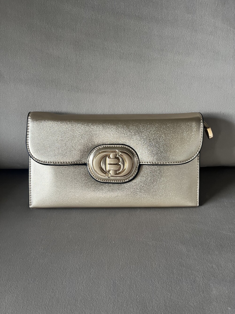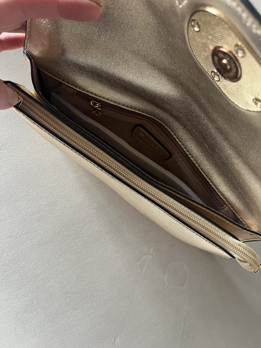 Deze prachtige royale tas heeft ook een lang goudkleurig hengsel van hetzelfde materiaal