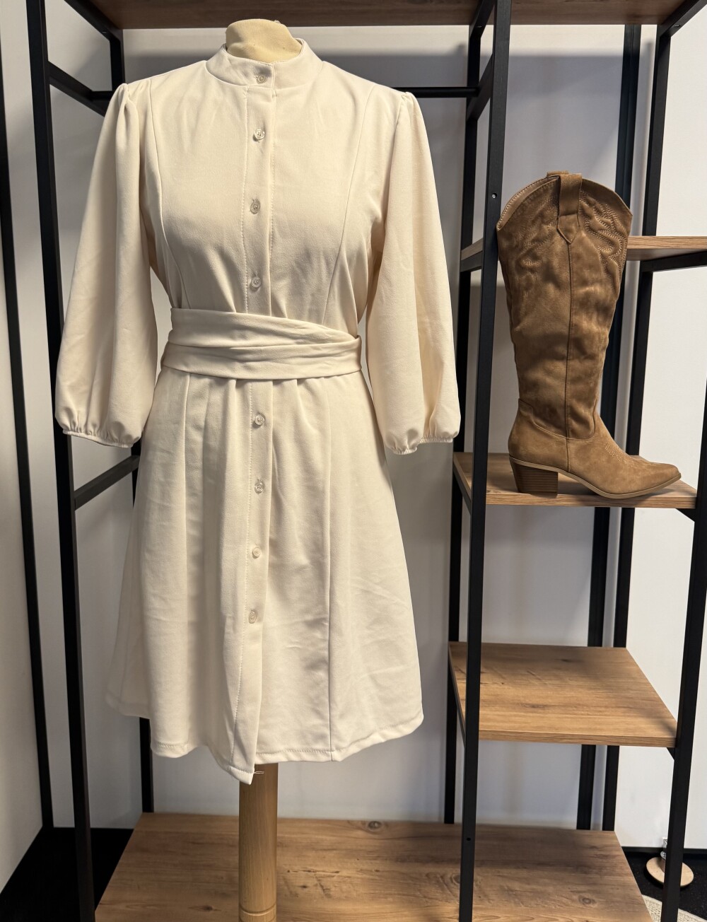Prachtige zand doorknoopjurk met driekwart mouw 98 cm lang (Extra foto komt z.s.m)