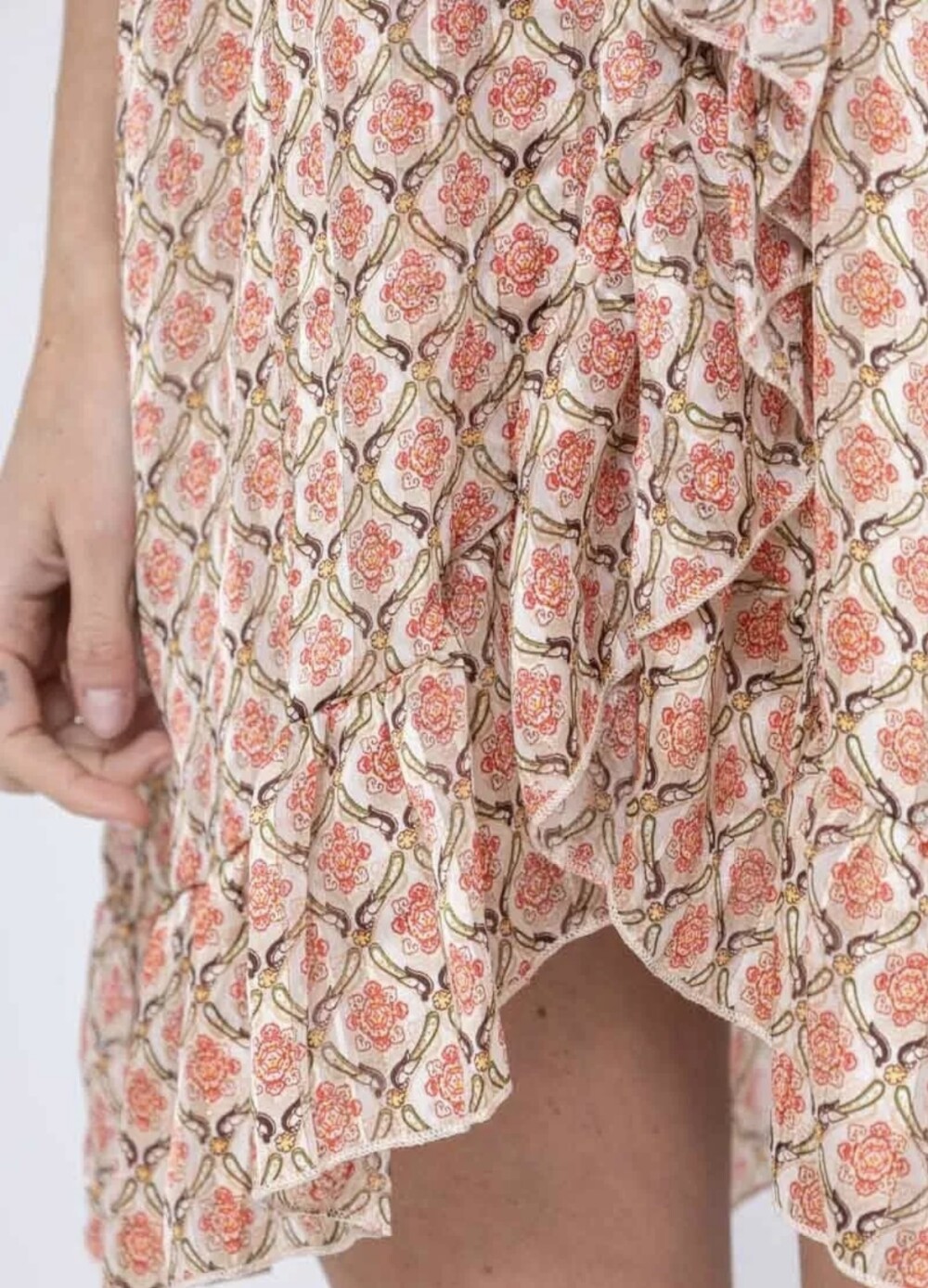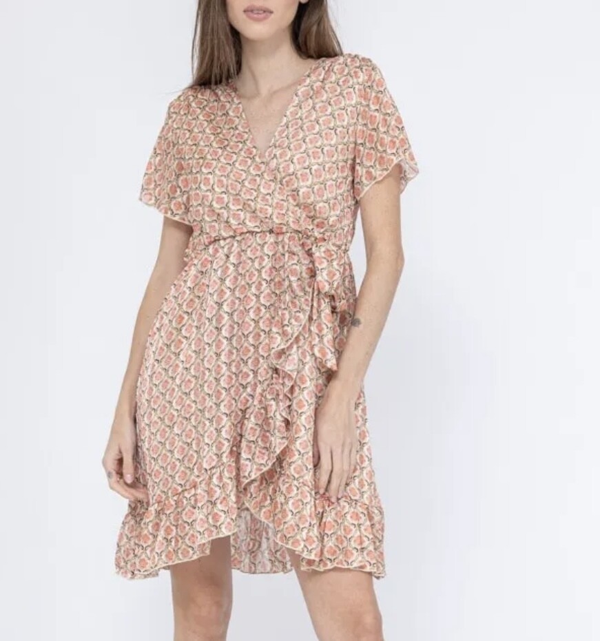 Dit leuke gevoerde jurkje in zonerprintje heeft een elastisch bandje in de taille