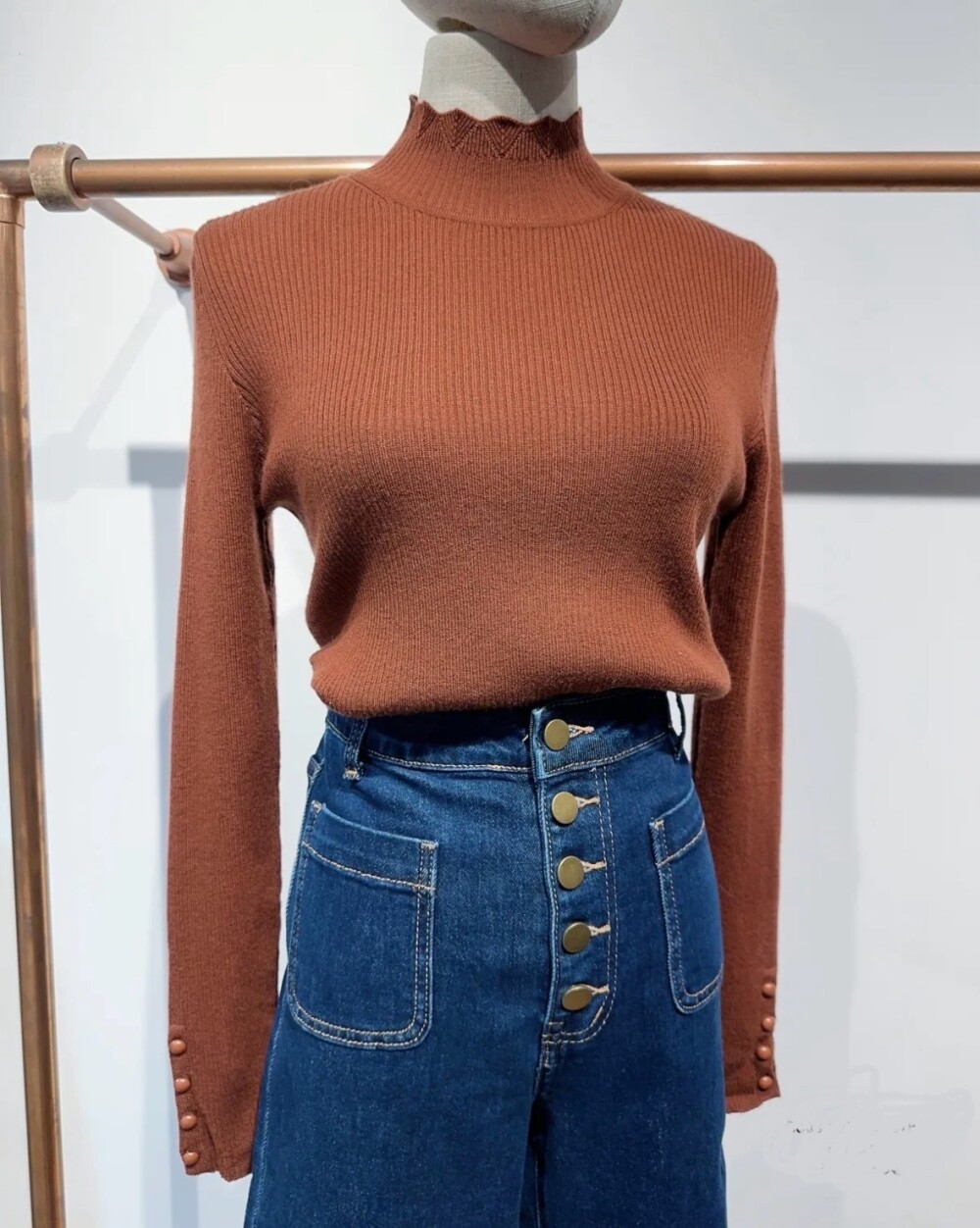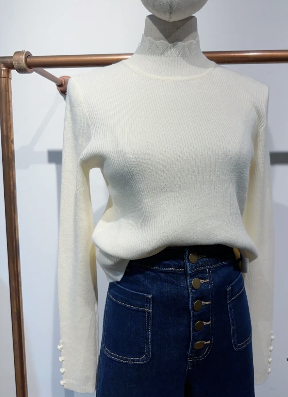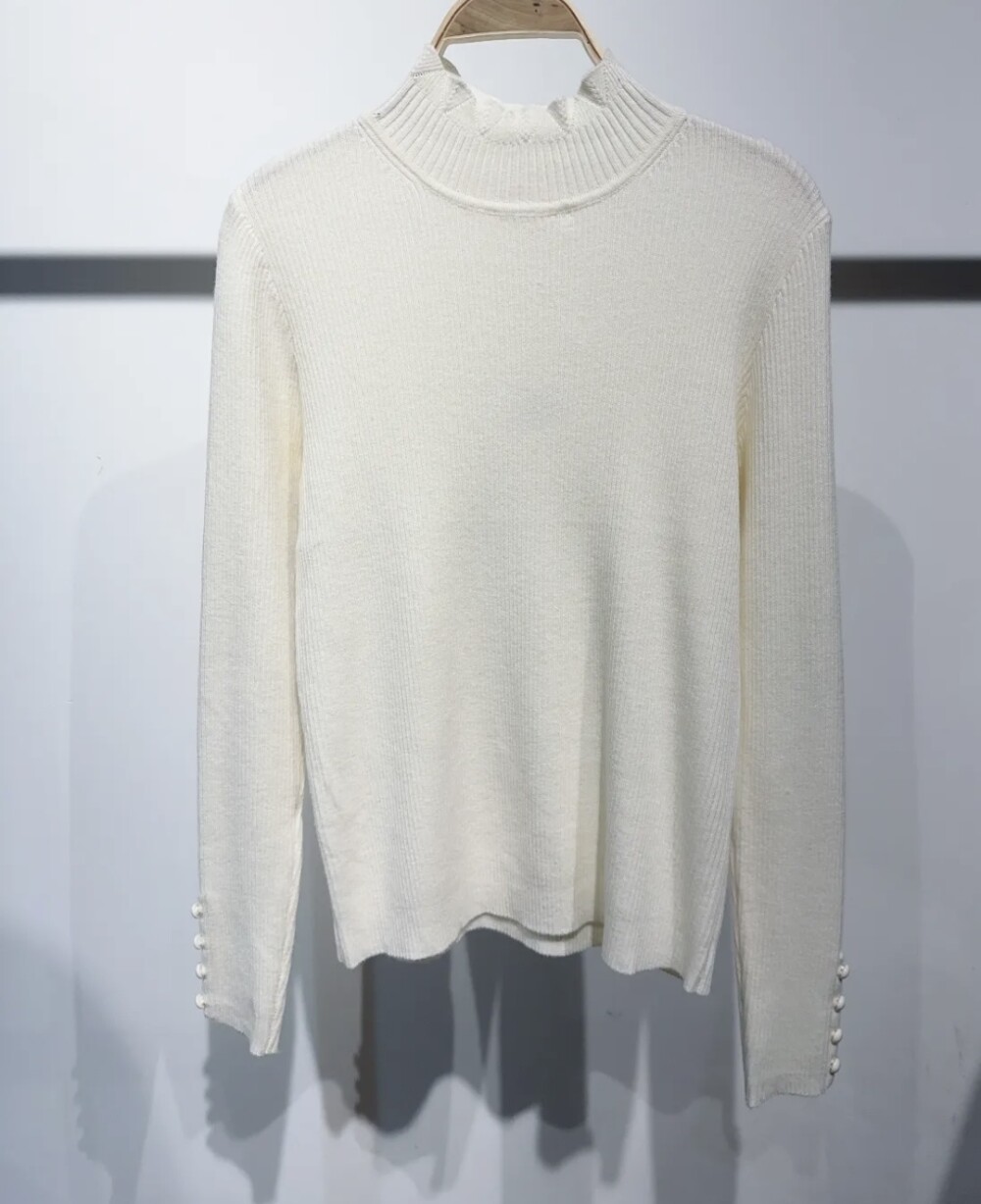 Prachtig fijngebreid truitje met mooi werkje in het boordje bij de hals